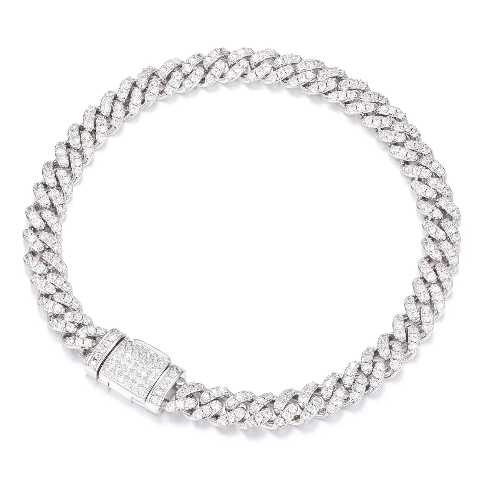 This luxurious Cuban link bracelet features a bold and eye-catching design, adorned with sparkling diamonds throughout. The intricate chain pattern and the dazzling gemstones create a truly stunning piece. The 14K white gold plating adds a touch of elegance and durability, making it a perfect accessory for any special occasion. The "S925" hallmark ensures that this piece is crafted from high-quality sterling silver, offering both beauty and longevity.