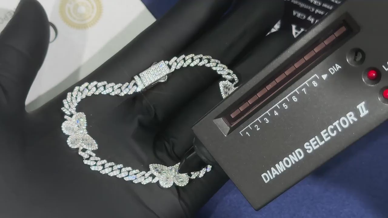 Add some sparkle to your wrist with the Butterfly Cuban Bracelet. Made with 6mm baguette 925 silver, this bracelet is both elegant and durable. The unique butterfly design adds a touch of whimsy to any outfit. Perfect as a gift or for treating yourself.