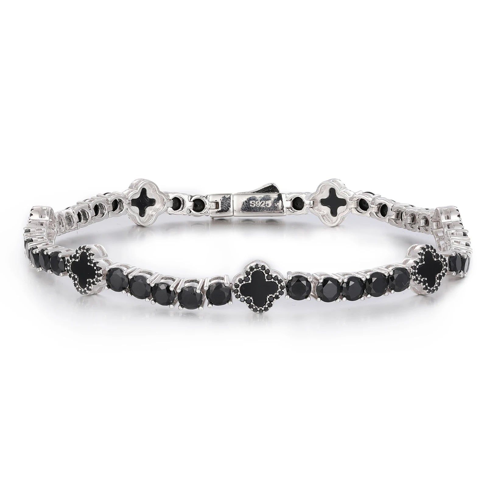 This elegant tennis bracelet features a unique design with alternating round gemstones and black clover charms. The clover motif adds a touch of whimsy and charm, while the sparkling gemstones create a dazzling effect. The 14K white gold plating ensures durability and a luxurious finish, making it a perfect accessory for any occasion. The "S925" hallmark guarantees the use of high-quality sterling silver, offering both beauty and longevity.